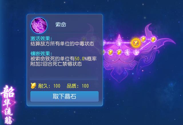 点了这套经脉的地府往往会选择毒辅助和封系,以方便跟在双固伤女儿出手后索命,万一索命倒地,还有50%概率附加2回合死亡禁锢,这样对手即使拥有龟速宠物在场,也将无法复活,可谓是一举两得。