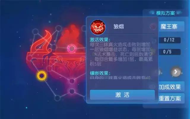 狼烟激活效果调整前,魔王每次主动获得印记,才能增加一层狼烟增益状态,并且每层是增加自身等级*0.2法术伤害。狼烟激活效果调整后,魔王每次用三昧真火造成击败目标,就能增加一层狼烟增益状态,每层增加2%法暴。改动后,让魔王对印记的依赖少了许多,同时魔王使用三昧真火的点杀频率也会有所提升。