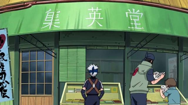集英堂其实就是木叶里面的书店,里面摆放着各式各样的书籍,当然最火爆的畅销书要数自来也的“亲热系列”三部曲,《亲热攻略》、《亲热天堂》和《亲热暴力》,作为忍界最畅销的小说,在动画原创小李忍传里,自来也的亲热系列曾经被药师兜和大蛇丸抢购一空,卡卡西作为《亲热天堂》的忠实粉丝,肯定没少在这间店里花钱。