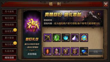 亲爱的玩家,在您回归后的一段日子里,我们准备了丰厚的礼物作为对您倾情回归的报偿,不要忘记每天上线来领取您的专属礼物哦!