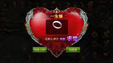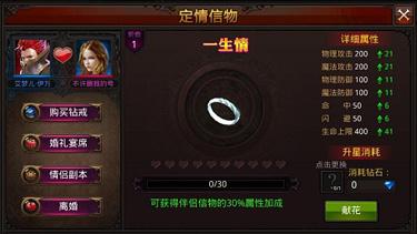 求婚时你需要选择一枚“定情信物”,操作界面即可切换信物,信物自带一套属性加成,价格越高的定情信物,基础属性也就越高。如果小伙伴对求婚时选的信物不满意也不要着急,因为在求婚成功后,在姻缘界面里你们还是可以随时更换更高品质的“定情信物”的。