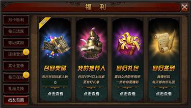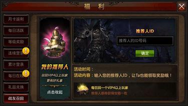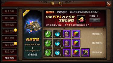 在福利界面中,新增加了一个“战友召回”的页签,复制“召回宣言”发给离线一段时间的玩家,邀请他们回归《全民奇迹》就可以获得该页面中的奖励哦!召回的人越多,获得的奖励也就越多。
