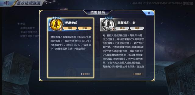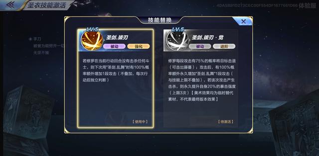 觉醒技能伴随着【圣衣】系统,修复圣衣各个部件,最终激活圣衣并习得觉醒技能,觉醒技能等级与未觉醒前技能保持一致,玩家可以选择携带二者之一进入战斗而不能同时携带。修复圣衣需要新的材料,后续会一一介绍。