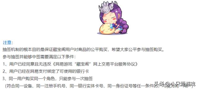 不过策划肯定也知道会有这种现象发生,并规定一个用户购买同一角色只能参与一次抽签(同一设备,同一手机,同一实名银行卡号,均视为同一用户)。想靠数量投机取巧的话成本估计也大了去了吧!这样的机制还是对玩家比较公平的,至少所有玩家只要能在公示期看到这些摆错价格的号,都有机会买到这个号,30秒也够正常玩家付款了。