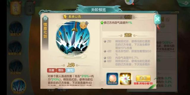 对单个敌人造成伤害(攻击*303%+内力*202%)。释放招式后,使得当前位置前后的己方侠客,下次攻击提升40%伤害,并使自身获得额外20%的真气值。