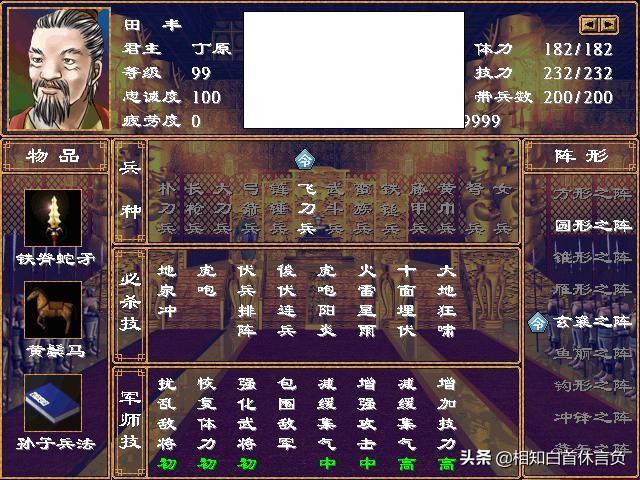 武将技:1级地泉冲,6级虎咆,11级伏兵排阵,18级后伏连兵,23级虎咆阳炎,29级火雷星雨,36级十面埋伏,40级大地狂啸。