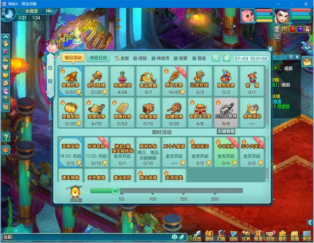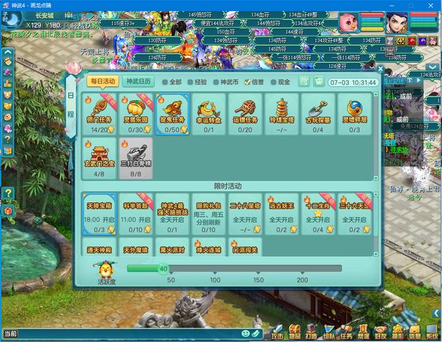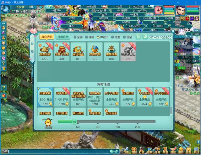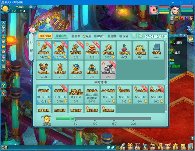 我们看到第一行,每日活动-神武日历—全部-经验-神武币-信誉-现金