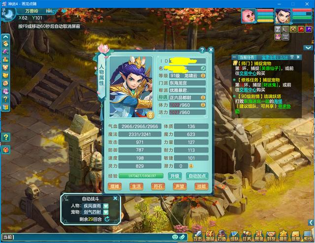 下面这个图是我自己玩的门派,你选择的每个门派都有自己的特点,可以根据自己爱好来选择。我选择的是男性角色龙傲天-门派东海龙宫-擅长法术,并且必中。这篇攻略适合91级以下玩家使用