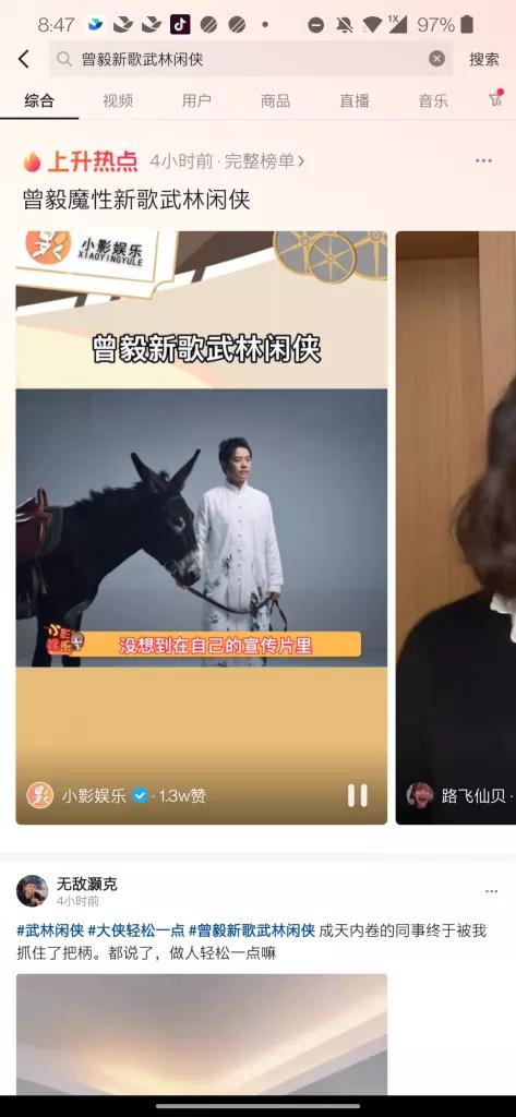 在抖音,#曾毅魔性新歌武林闲侠 相关话题也受到用户关注,进入上升热点。