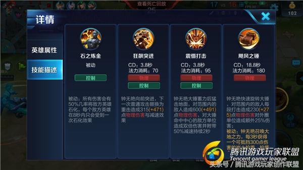 核心技能介绍石之炼金(被动技能):钟无艳的核心技能,使得钟无艳的所有伤害都带有一定几率的控制效果,能够在团战中打出不少的控制效果。飓风之锤(三技能):大范围的aoe伤害,由于释放时钟无艳可以移动,所以使用时尽量打中更多的敌方英雄,配合被动技能打出更多的石化效果。