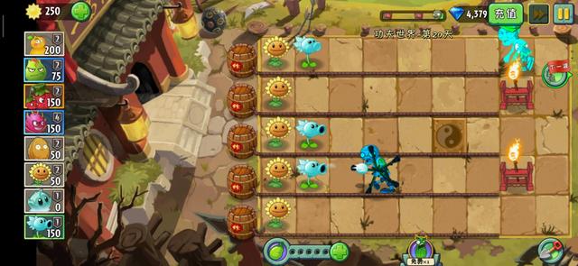左侧最后一列我们空出来,种植的冰冻生菜,引信被点燃了遇到冰冻生菜就会被熄灭,如果引信在最后一排被熄灭了那我们就可以放心对付僵尸不用分神注意引信的情况了。这是针对于没有寒冰射手的的玩家用的方案,但是冰冻生菜冷却慢,前期固然会炸掉几个炸药桶,连带周围的植物也会被炸飞,所以尽量还是用寒冰射手提前灭掉火焰才是最好的选择。说到火把,必然的火把是武器架上的常客,在这一关我们就不推荐依靠武器架削弱僵尸的防御力等等的了,不让火把靠近炸药引信才是关键。所以,火葫芦攻击的时刻是在火把僵尸靠近引信前点燃,或者有僵尸要靠近火把武器架的时候。
