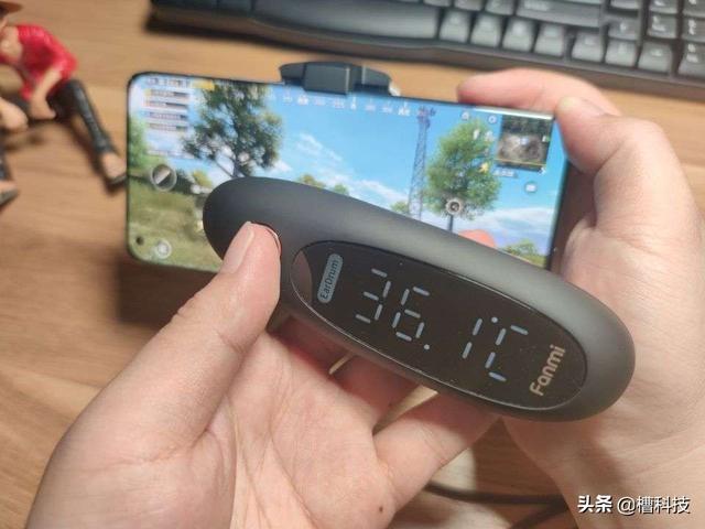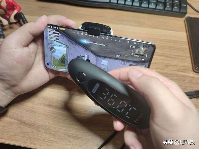 于是乎,在这样的情况下我便将一加18W冰点散热背夹将手机卡好,开启中档模式,一股凉风悠然而来,在带着散热背夹玩了不到五分钟的情况下,用温度枪测量发现手机的温度只有36℃多一点点了,这样的降温速度堪比冰箱呀!