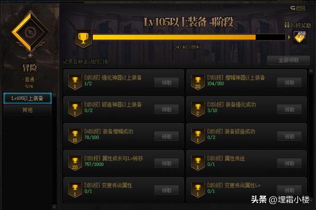 冒险模块当中105以上装备栏当中积累成绩任务经验可以获得不等数量的金绿柱石,但是成就需要勇士们的日积月累,短时间内很难快速完成。