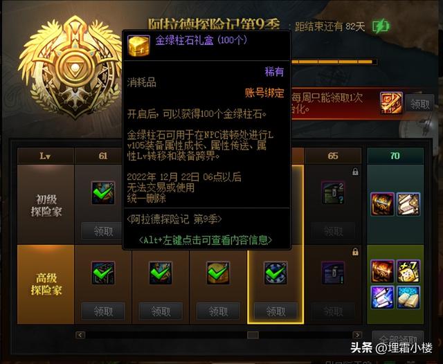 本次的阿拉德探险记在不同的等级阶段加入了金绿柱石礼盒,普通探险家一栏为金绿柱石礼盒(10个),在整个探险记当中可以获得4个;高级探险家一栏为金绿柱石礼盒(100个),在整个探险记当中可以获得25个,若进阶了探险记的话可以累积获得2540金绿柱石。