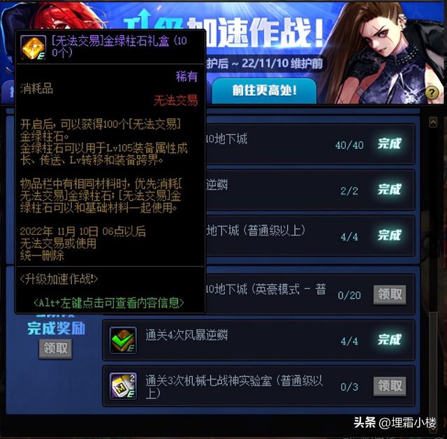前往更高处任务阶段当中,共计可以拿到三个[无法交易]金绿柱石礼盒(100个),需要勇士们分别通关1、2、4次任意难度的风暴逆鳞,共计可以拿到300个无法交易的金绿柱石。
