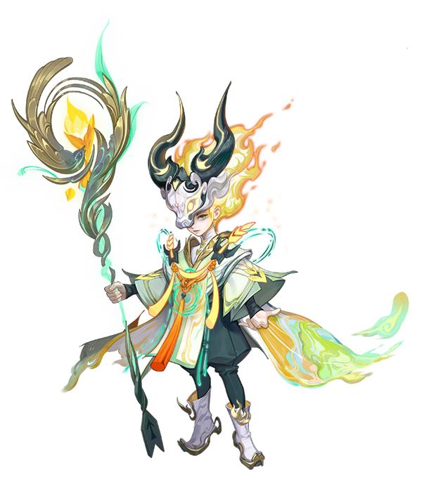 如袖口造型参考了梯田条状阶台式的结构;披风融入山川、河流的意象;鞋子以耕牛的造型进行点缀;头发使用了火焰燃烧的效果,寓意火神谱系;武器是丹雀衔谷与神农耒耜的结合,寓意着自然之力与人类价值的合二为一。此外,大量线条元素的应用,让皮肤整个形象都充满生命力,表现出五谷文化的源远流长。