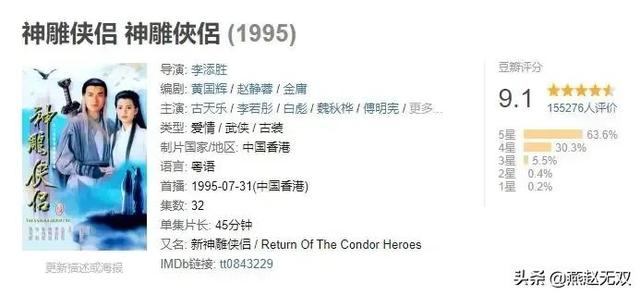 以上几个版本各有千秋,都是比较不错的作品。古天乐版本豆瓣评分高达9.1,算是难以超越了。黄晓明的杨过差点意思,也有7.4的评分。陈晓版小龙女被称为小笼包,4.9的评分有点低,其实整体还是不错的。至于最新的19版本怎么样,还要等到出来才能评定呢!