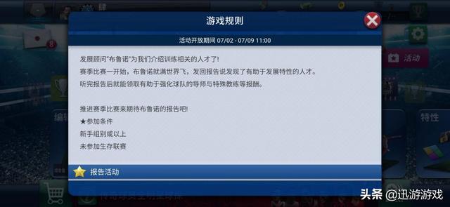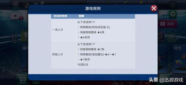 布鲁诺活动我们说过了,只要参加比赛,赛后一定会有,也就是只要你打的比赛够多,就可以得到相应的奖励,奖励内容是有助于强化球队的导师和特殊教练的。其中奖励细致划分为四类,分别是普通人才、优秀人才、一流人才和终极人才,普通人才的奖励内容是“特性经验值-小”和4星导师,优秀人才奖励内容是“特性经验值-中”和5星导师。