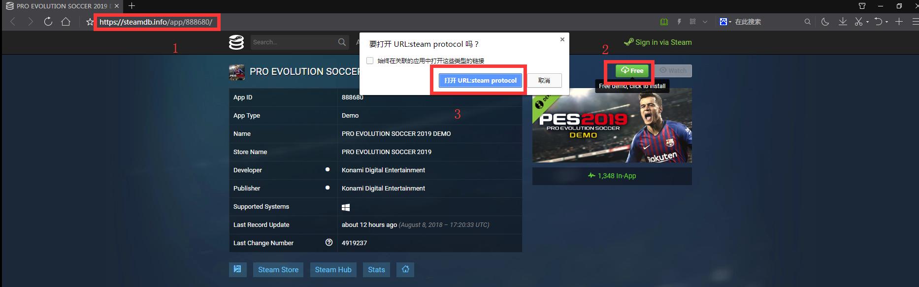 2.打开你的电脑浏览器,在地址栏输入【https://steamdb.info/app/888680/】,然后在出现的页面右上角点击【free】,接着从弹出的提示框中点击【打开steam protocol】,即可在steam中下载pes2019试玩版。如果你没有steam客户端和账户,需进入【https://store.steampowered.com/】下载客户端并注册账户。