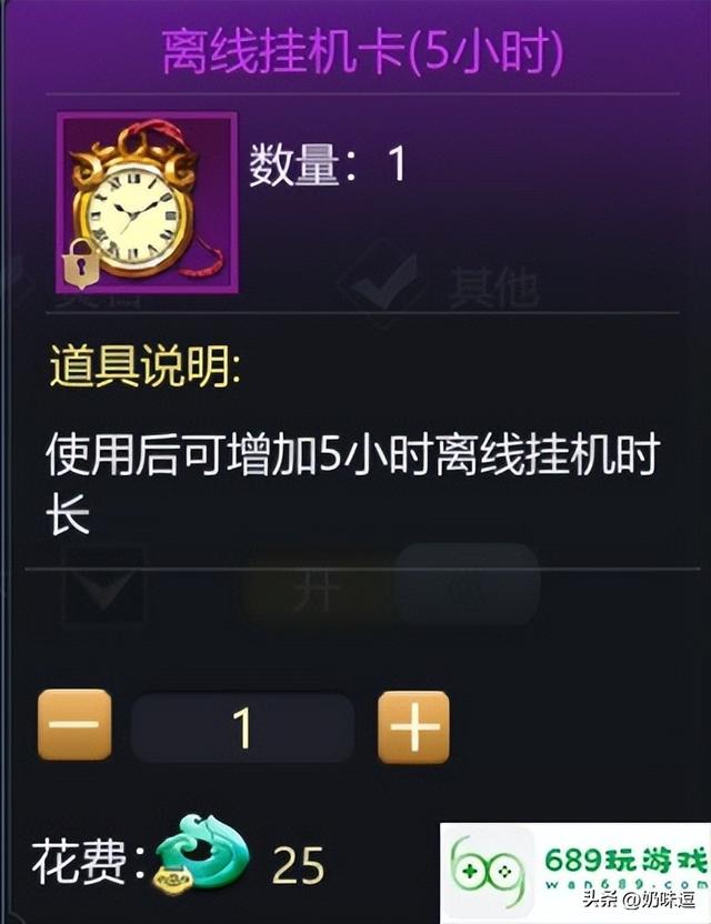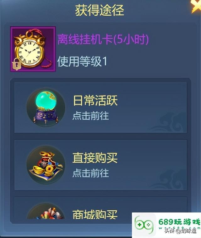 在所弹出的框中,可以使用“离线挂机卡(5小时)”来补充,那么获得的途径有多种,比如日常活跃、直接购买、商城购买