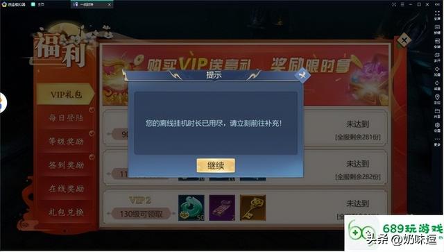 比如说在电脑模拟器中运行一战封神,进入游戏,会弹出一个提示“您的离线挂机时长已用尽,请立刻前往补充”