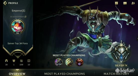 中央的英雄背景,则是你玩得最多的英雄,你玩得最多的三个英雄头像会在这个页面显示,点击英雄头像会显示你该英雄的使用场数和具体胜率。最右侧则是你的当前段位。