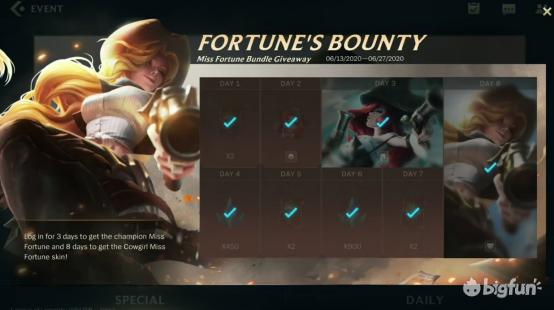 点击活动按钮,自然是进入到游戏的活动界面。活动分成两种,特殊活动和日常活动。目前测试服的特殊活动只有连续八天签到,第三天送厄运小姐,第八天送厄运小姐的伴生皮肤,未来这个界面应该会有各种活动,比如泳池派对、未来战士等。而每日活动就是日常任务系统。