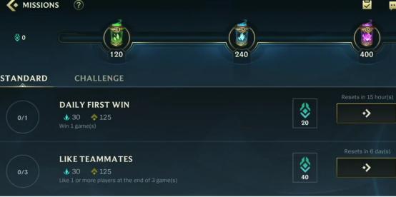 手游为了保持玩家的粘性,则是推出了任务系统,任务分成三种类型。每日任务、每周任务和挑战任务,每日任务比如首胜,每周任务比如点赞队友次数,完成这些任务后会获得蓝色精萃、经验值和进度奖励、进度奖励是用来解锁“胶囊”,胶囊里可以开出一些其他的游戏物品。挑战任务就是达到一些数值后解锁的,类似于成就系统。