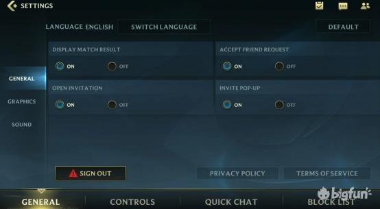 先来看看常用设置,分成三个小部分,通用、画面和声音。通用包括切换语言、显示/关闭战绩、开启/禁止好友添加、开启/禁止对战邀请、开启/禁止游戏静音。画面功能则是画面品质、画面帧率、视觉效果、音效、伤害数字、截图等方面的设置。声音功能则包括各种声音的大小调整。