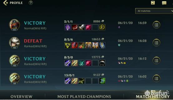 右下方的三个页面,第一个就是总览,第二个则是玩得最多的英雄,点开后可以看到你每个英雄的使用场数和具体胜率。第三个则是你的对战历史,点击后看到你最近的游戏历史战绩,包括你使用的英雄、游戏模式、胜负情况、出装、战绩、时间和对局具体信息。对局具体信息点开后,和PC端的内容差不多,可以显示各种数据统计,比如团队经济、团队经验、资源掠夺、人头数、小兵数等。