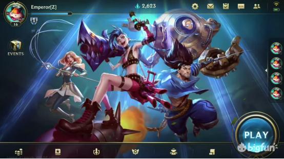 左上角是玩家的名字、头像和等级,下方则是游戏活动。正中央的数字是蓝色精萃,右上角依次是设置、邮箱、公告、消息、好友和信号电量提醒。最右侧则是好友列表,下方的Play就是开始游戏。最下方的一排则是商店、收藏、英雄设定、排行榜和任务。