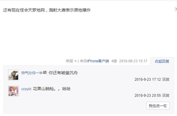 更过分的是还会有盘丝的怪物用天罗地网,挂机平砍物理系莫名躺枪,大唐的地位更是一落千丈了。不过就在这位玩家疯狂吐槽的时候众网友却反过来开始嘲讽这位玩家,一时间这位吐槽的玩家倒成了众矢之的!