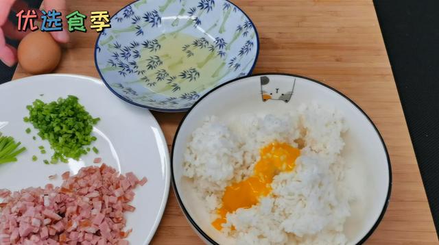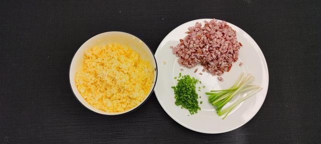 1、食材准备:小葱、熟米饭1碗、香肠1根、鸡蛋黄2个