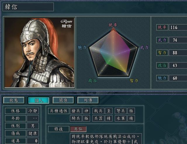 兵仙韩信无疑是西汉刘邦势力的最强武将,统帅属性116仅次于兵圣孙武。而且属性也非常全面,不仅统帅超绝而且智力也有88,完全可以单独带队。其中要论兵种,韩信的枪兵和戟兵都是顶级的,都是神圣级。其中最绝的要数戟兵,是游戏里唯一的圣级,像孟珙这样的人物虽然号称戟神,但在韩信面前依然是自愧不如的。