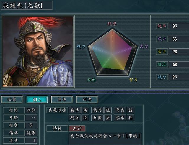 要论兵器最强,血色中唯一能和戚继光一较高低的要数兵圣孙武。就基本攻防来说,戚继光的所带的兵器部队比不上兵圣孙武。兵圣不仅统帅超高,而且兵器也有神级。但戚继光强就强在他的特技工神上,一出手就是暴击。而且戚继光自带军魂光环的工神特技的同时,兵器适性也是顶配的圣级。
