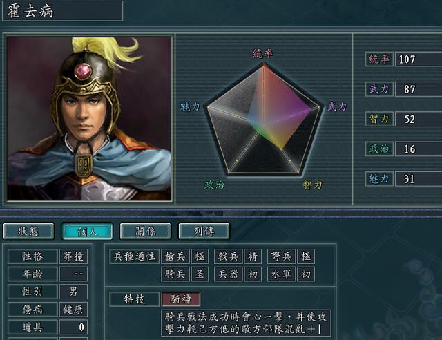 霍去病作为西汉虐杀匈奴的扛把子,骑兵纵横漠北的顶尖统帅。在血色中也给了唯一的骑神,兵种也是最高的圣级,比卫青的神级都要高。所以在平原上,霍去病只要带上骑兵,基本绝大多数的敌人都只有被控到死的份,如果平原骑兵一对一,游戏里卫青完全不是霍去病的对手。当然虽然霍去病的统武都超高,不过智力属性较低,不适合单独带队,最好给他配一个高智副将。