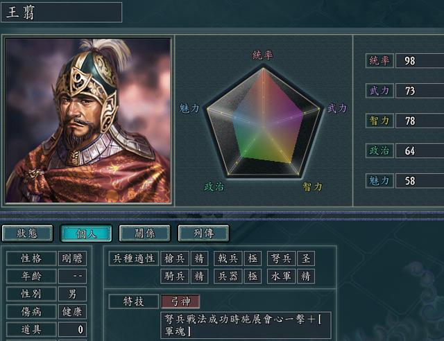 王翦不愧是弓神,最牛的兵种就是他的弩兵,直接是唯一的圣级。所以王翦也是弩兵专业户,带上弩兵非常BUG,如果在配上他的儿子为副将,简直就成了守关堡垒,不仅输出高,而且打击面还非常广。特别是任何靠近他们防守的关卡的敌军部队都会被射成筛子,非常惨。所以玩家体验的大秦帝国有王翦在,东面的敌人要想跨关而入都要付出惨痛的代价。当然岳飞和白起的弩兵也有神级适性,再加上超高的统帅属性,仅论弓兵也有跟王翦一较高低的资本。为了给弓神面子,最强弩兵的称号还是给王翦了。