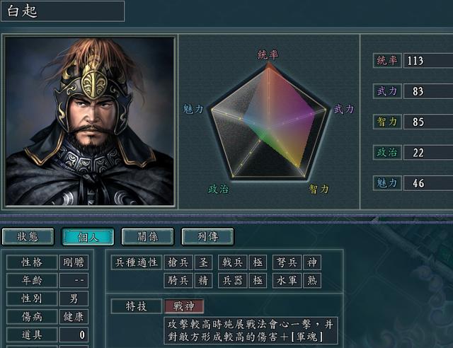 白起无疑是游戏里数一数二的超强武将了,统帅属性是顶尖级别的,突破了110堪比兵仙,自带顶级战暴光环,非常强大。而且自带战神特技,所以一般的武将带队都很少能过战神2个回合。另外白起的属性和兵种也非常全面,就算是单人带队都是没有问题的,群攻方面有神级别的弩兵,单攻方面有最为强大的枪兵,攻防顶级,特别是敌方骑兵要是不幸撞枪口了,就算是万人部队,都很可能被1回合带走!