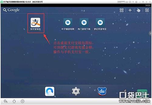 玩游戏难免会充值,而支付金额时又会遇到一些琐碎的麻烦事情。叶子猪手游模拟器这时专门为玩家提供了支付宝钱包,玩家点击模拟器桌面上的支付宝钱包,登陆支付宝后,就能很快捷的支付完成游戏里的充值消费。