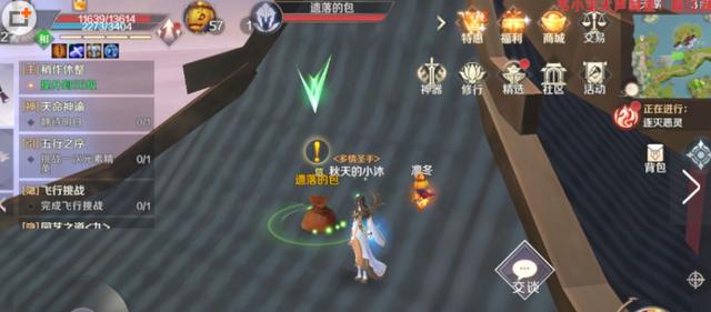 从通天湖乘坐飞机飞到顶部,有三座天空之城叫做千泪城,在上面有一座带有塔尖的塔顶,上面有一个"遗落的包",点击感叹号触发任务,根据任务提示到对面三楼找到萝拉,最后萝拉会问你天空之城有多少根巨大的锁链,回复10条即可解锁"古塔倩影"