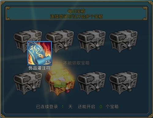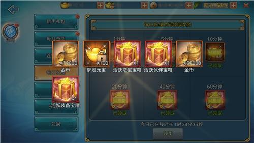 每日在线60分钟,现可获得装备、伙伴、法宝宝箱各一个。每个都内含想关系统的强力奖励!