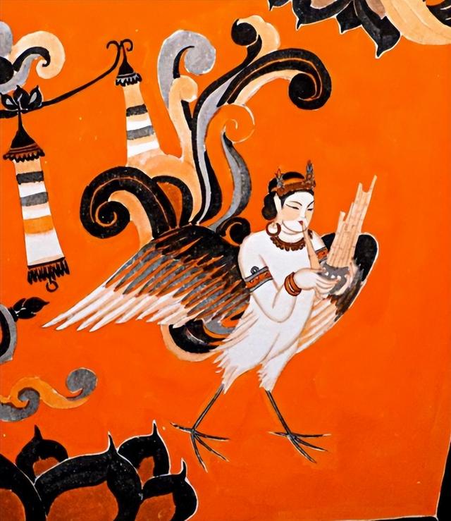 妙音鸟曾出现在敦煌的石窟壁画中——在无量佛(阿弥陀佛)的莲座下,绘有一对异鸟:人首鸟身,毛色斑斓。壁画中的妙音鸟在吹笙献曲。