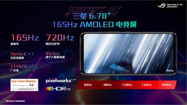 ROG6天玑系列配备 6.78 英寸 165Hz AMOLED HDR10+ 显示屏,触控采样率达到业界领先的 720 Hz,游戏视觉效果顺畅自然。刷新率可以设置为 60 Hz、90 Hz、120 Hz、144 Hz 或 165 Hz刷新率,获得无与伦比的游戏体验。ROG玩家国度与知名视觉处理公司 Pixelworks® 进行深度合作优化,从而使这块屏幕拥有一流色彩准确性和超强的视觉效果。