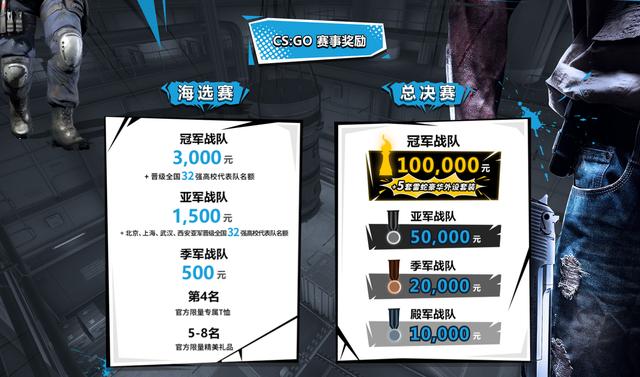 本届完美世界全国高校联赛(秋季赛)的总奖金池再度提升,高校赛总冠军奖金依旧高达10万元,此外冠军队伍每人还将获得雷蛇豪华外设礼包一套!另外,为了将奖励带给更多热爱电竞的同学,本届高校联赛海选赛各站前八名均可获得精美礼品!不用再为自己空手而归遗憾啦。