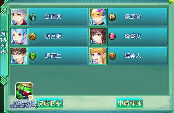 在《梦想世界》手游中,成为别人的师父是一个十分难得的荣誉,等级≥65级的玩家可在每月第一、第三周周六晚20点拍卖获得收徒资格证,每个师父最多可以收10个徒弟,等级≥15级且≤40级的玩家可对师父列表中的玩家进行拜师申请,若对方通过申请则成功建立师徒关系。