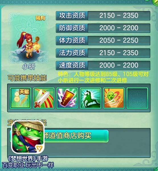 全新萌宠小昕只能通过师道值商店购买,小昕的技能与资质固定且无法进行洗宠,角色等级达到85级和105级可给小昕进行一次和二次进修,分别需要花费800和1200师道值;小昕无需进修即可进行染色。