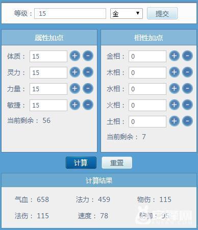 2、玩家选择以上的职业和等级后,就可以在相性点和属性点中,就可以直接选择+和——直接进行加点,等在系统加点之后,就是可以计算了,计算之后就是你拥有的属性点。