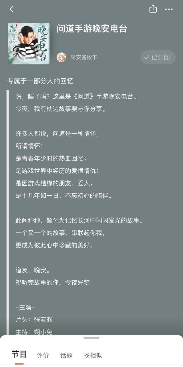 十年问道,十年青春。一转眼,《问道》手游已陪伴各位道友近4年时光,春去秋来,日月交替,身边的人来来去去,这里有许许多多的故事正在发生,道友们也有很多话要说,有很多人要祝福,有很多事要感谢,有很多记忆要回顾,有很多老友想要相见……时值《问道》手游4周年,开设晚安电台,每周一期,晚安相见,和张若昀一起重温属于道友们的问道青春。