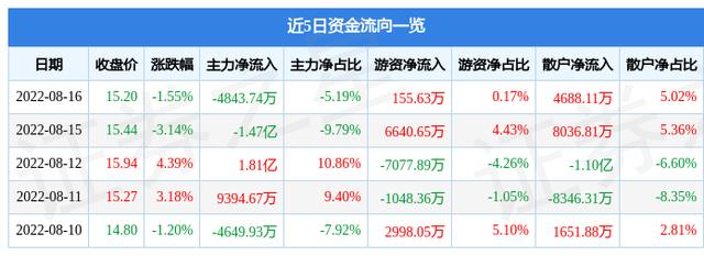 资金流向数据方面,8月16日主力资金净流出4843.74万元,游资资金净流入155.63万元,散户资金净流入4688.11万元。