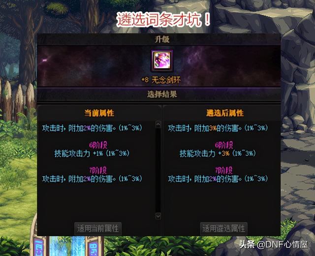 “雨中情”失败后,旭旭宝宝多次找人遴选,绝望矿石源源不断消耗,几万个全打水漂,皆没有洗出来!要知道,不洗出完美属性,还没办法佩戴,这就比较麻烦。毕竟一旦佩戴上,要封起来的话,还得3天多才能解封!对于改8无念剑环遴选,旭旭宝宝直言太坑了,就是一个洗神话机制,已经成无底洞。只是一件改造装备遴选,就这么的无奈,后面可咋整!